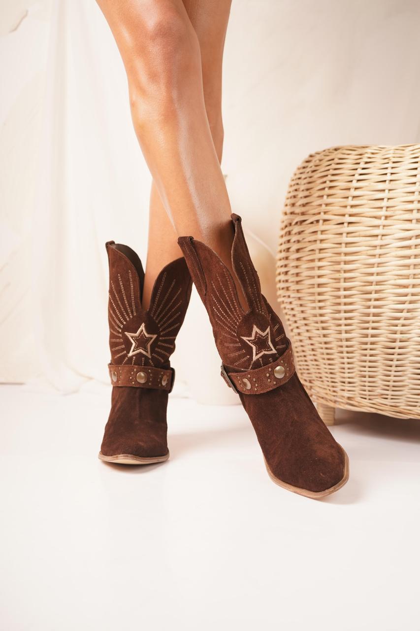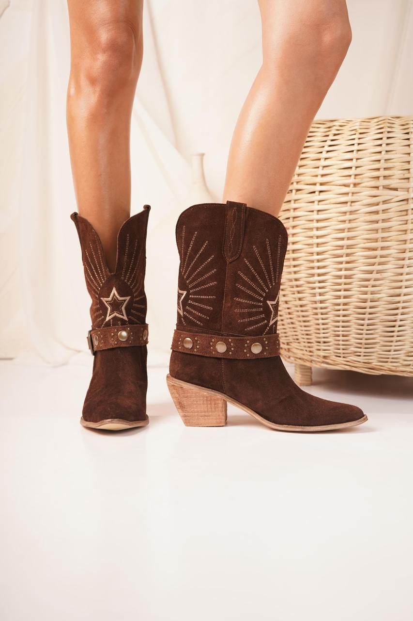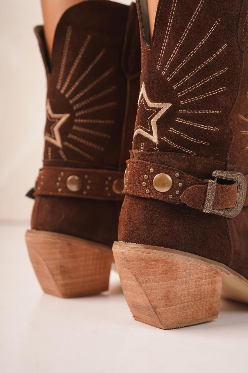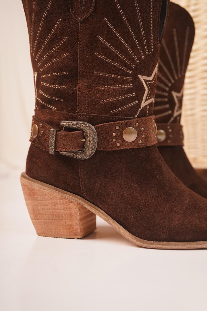 Materiales: Cuero gamuzon, base artesanal, taco de 7cm, detalle bordado, con su cinto desmontable, talles del 36 al 40. Colores: Negro, chocolate, suela, vison.