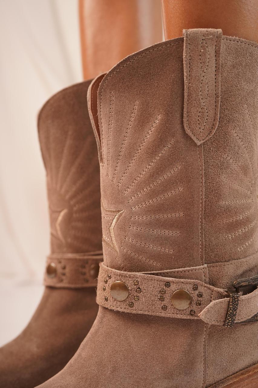 Materiales: Cuero gamuzon, base artesanal, taco de 7cm, detalle bordado, con su cinto desmontable, talles del 36 al 40.